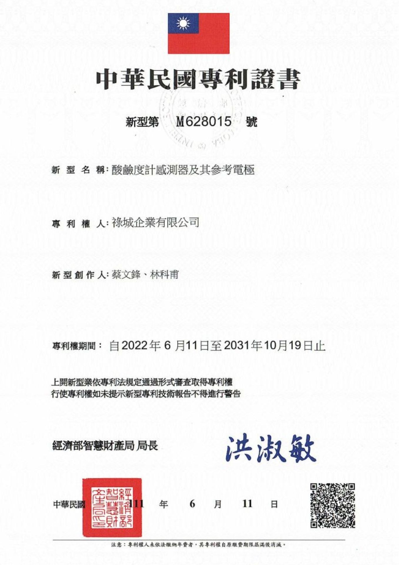 TAIWAN PATENT CERTIFICATE NO.: M628015